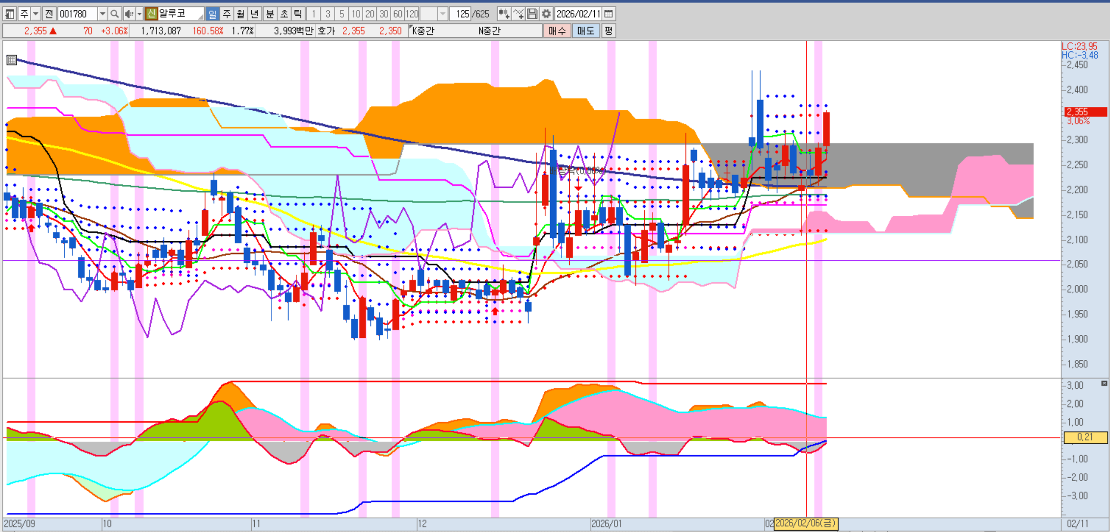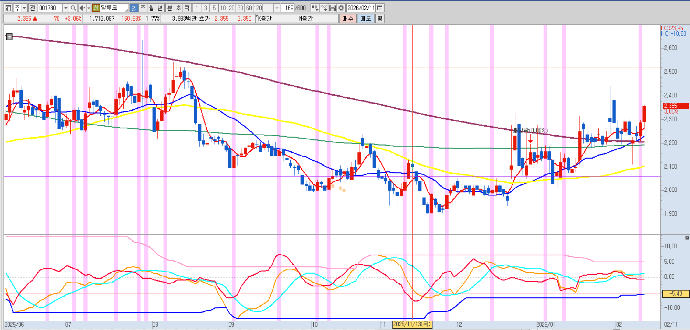 단기적으로 알루코의 주가는 LME 알루미늄 가격의 움직임과 높은 상관관계를 보일 것으로 예상됩니다. 현재 기술적 분석상 알루코는 2,000원 초반대의 강력한 지지선을 구축하고 상승 추세로 전환을 모색하고 있습니다. 단기 이동평균선(20일, 60일)이 정배열 구간으로 진입하고 있어, 모멘텀 트레이더들에게는 매력적인 진입 구간이 형성되었습니다.